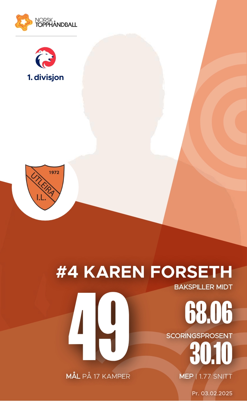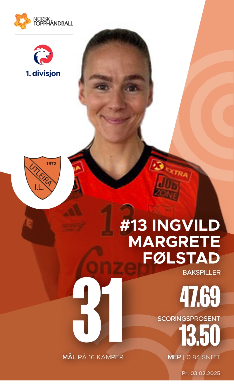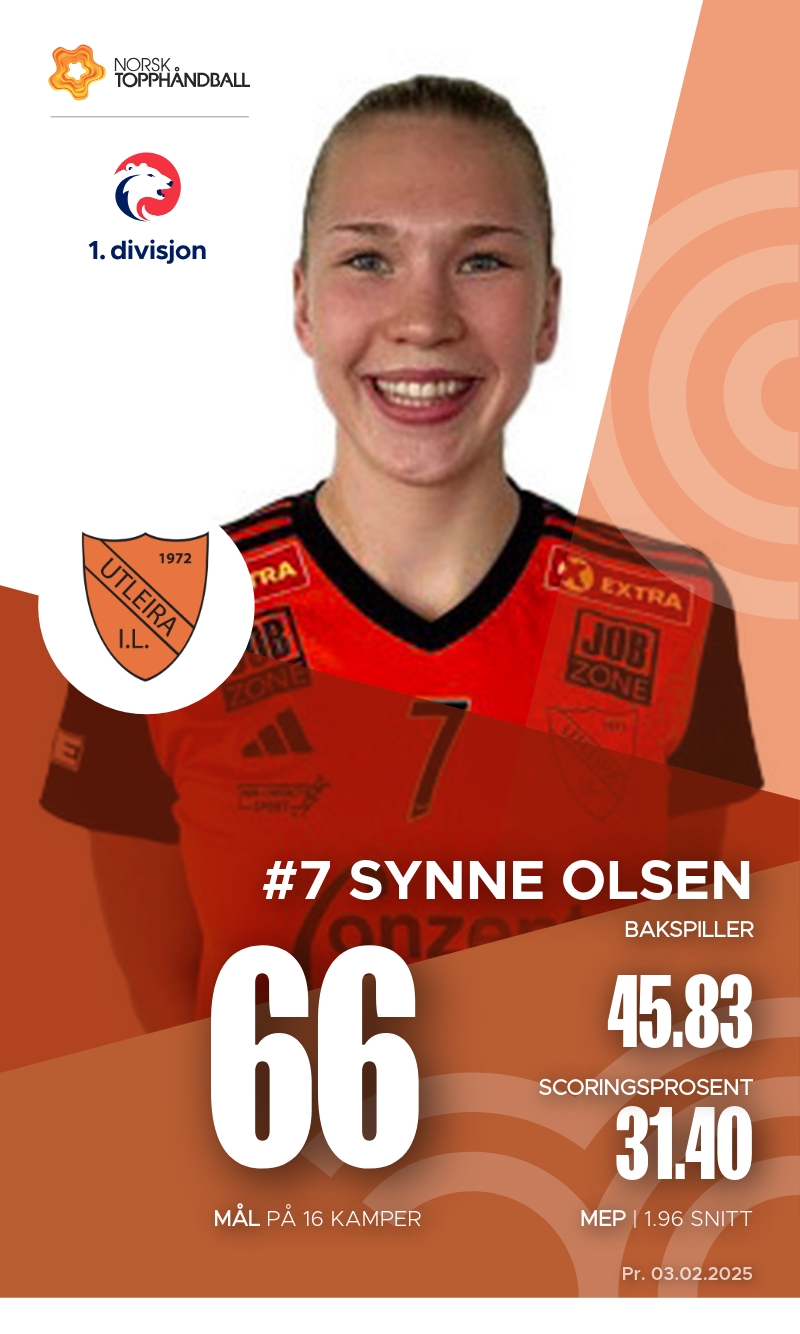 Utleira har flere nøkkelspillere som har vist imponerende ferdigheter så langt i sesongen. Synne Olsen er en av lagets stjerner med 66 mål og 53 assists, noe som gir henne en høy effektivitet med en MEP på 4.3. Også Karen Forseth har bidratt sterkt med 49 mål, til tross for noen bestrafninger. Ingvild Margrete Følstad har vært en solid playmaker med 37 assists og en MEP på 2.9. Disse spillerne er essensielle for Utleira sin suksess i 1. divisjon, og deres prestasjoner vil være avgjørende i kommende kamper.